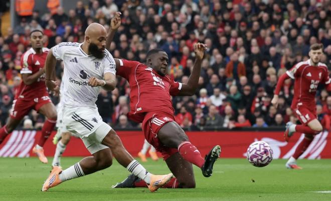 趁着阿根廷人倒地未起,布鲁诺-费尔南德斯捡到皮球,分给阿马德-迪亚洛,后者又直塞姆伯莫。姆伯莫的射门从利物浦门将马马尔达什维利两腿间穿过破门。